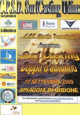 Organizzata dal Club Pescatori Sportivi Dilettanti Surf Casting Udine in collaborazione con la sezione Provinciale FIPSAS di Udine e Venezia l’APS Martin Pescatore il patrocinio del Comune di San Michele al Tagliamento e gli sponsor PLINE, VERET e BARENA , si è svolta il 19 settembre 2009, la prima edizione della Coppa d’autunno di Surf casting.