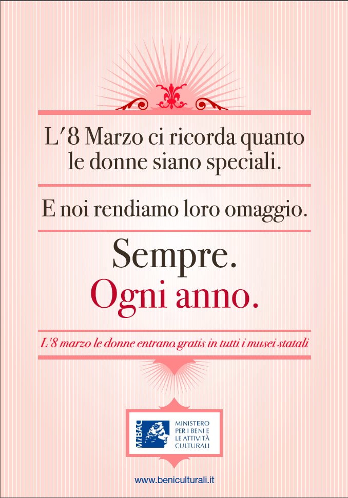 In occasione dell’8 marzo, si ripete, anche quest’anno, la tradizionale promozione del ministero dei Beni culturali che offre l’ingresso gratuito per le donne, in tutti i musei e luoghi di cultura statali, oltre a iniziative speciali, eventi a tema e visite guidate.