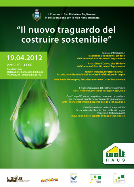 Il convegno è organizzato dal Comune di San Michele al Tagliamento in collaborazione con Wolf House, azienda leader delle case prefabbricate in bioedilizia.