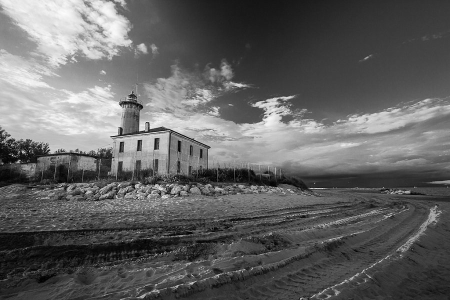Sul sito www.zmphoto.it abbiamo trovato questa bella foto in bianco e nero del Faro di Bibione al tramonto dell’utente “http403”.