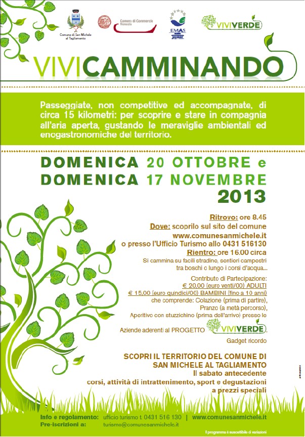 Domenica 17 Novembre 2013, il comune di San Michele al Tagliamento organizzerà una passeggiata naturalistica di circa 15 chilometri con sosta gastronomica alla scoperta del verde di Bibione percorrendo strade e sentieri di Bibione dal titolo “VIVICamminando”.