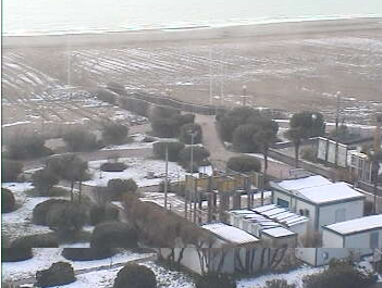 Al mattino, la spiaggia e le strade della città di Bibione erano candide e coperte da un manto bianco di alcuni centimetri di neve che ancora è presente a macchie.