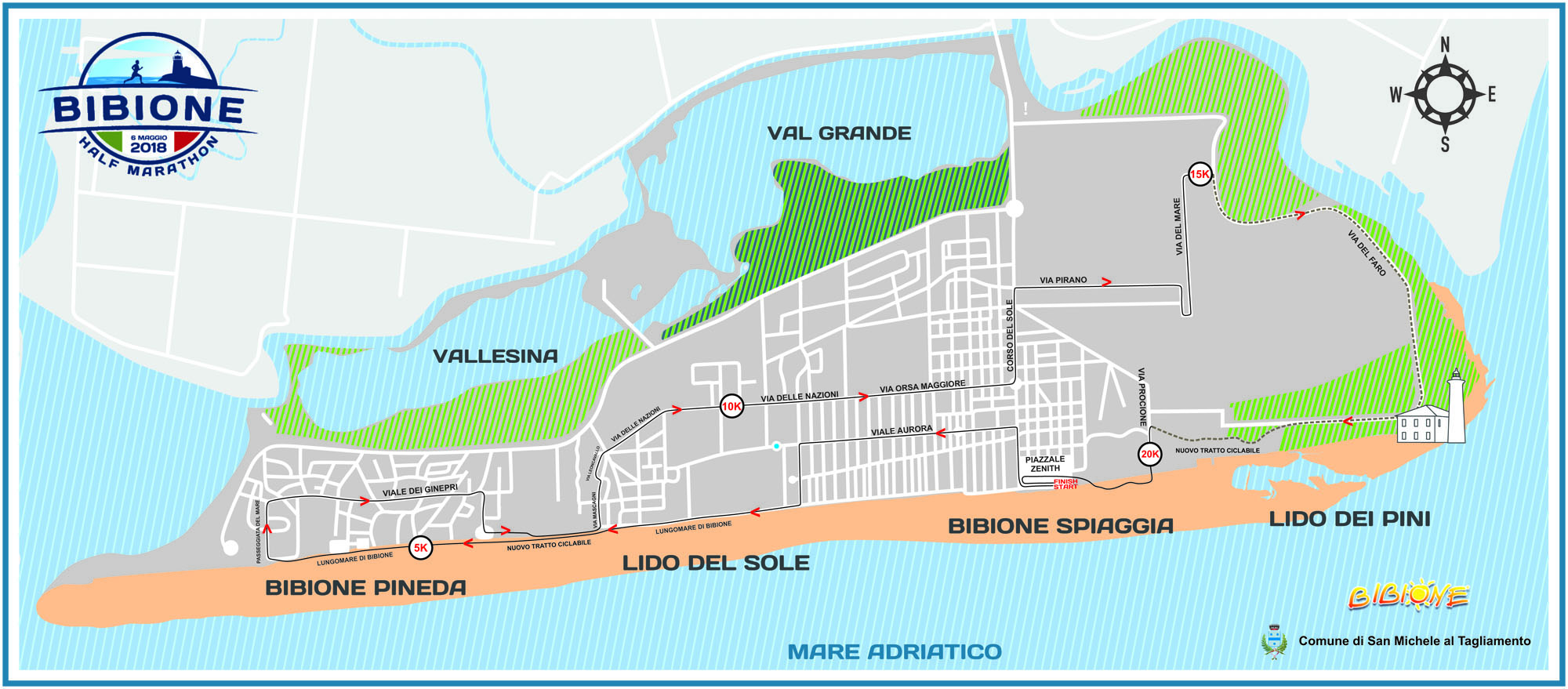 Domenica 6 maggio 2018 si terrà la terza edizione della mezza maratona internazionale competitiva, la Bibione Half Marathon. Quest’anno ha superato il numero di iscritti dell’anno precedente, raggiungendo il numero di circa 2000 atleti.