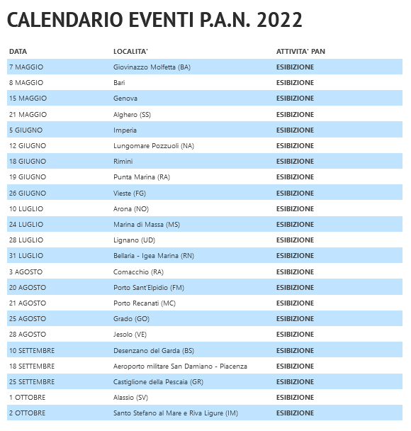 Di seguito il calendario degli eventi della Pattuglia Acrobatica Nazionale: