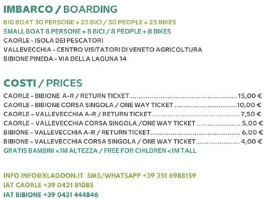 Il costo è di 1€ a persona. Le barche sono attrezate per trasportare al massimo 25 persone e quindi fino ad un massimo di 25 biciclette Per i bambini fino ai 9 anni, il biglietto è gratuito. I biglietti si possono acquistare al faro di Bibione oppure direttamente a bordo. Non è richiesta la prenotazione.