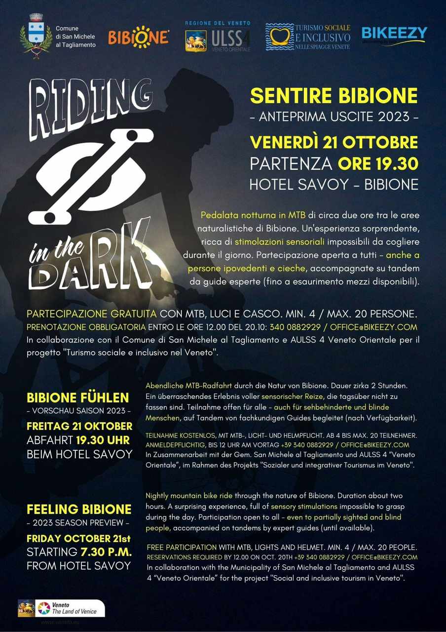 Due ore di corsa in notturna alla scoperta delle meraviglie di Bibione. L’esperienza è aperta a tutti, anche alle persone ipovedenti e cieche in quanto possono essere accompagnate su tandem da guide esperto (fino ad esaurimento mezzi).