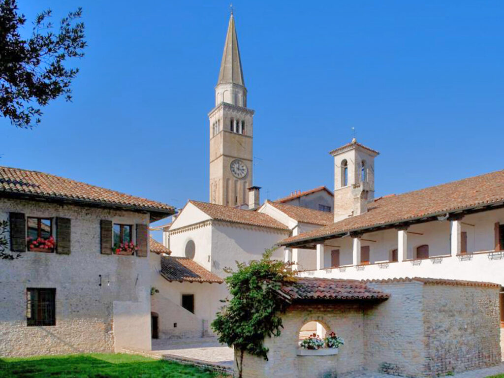 Nel piazzale dell’Abbazia si affaccia il Palazzo del Comune, la cancellerie abbaziale (sede del potere civile nel medioevo), la torre campanaria e la torre Grimani.